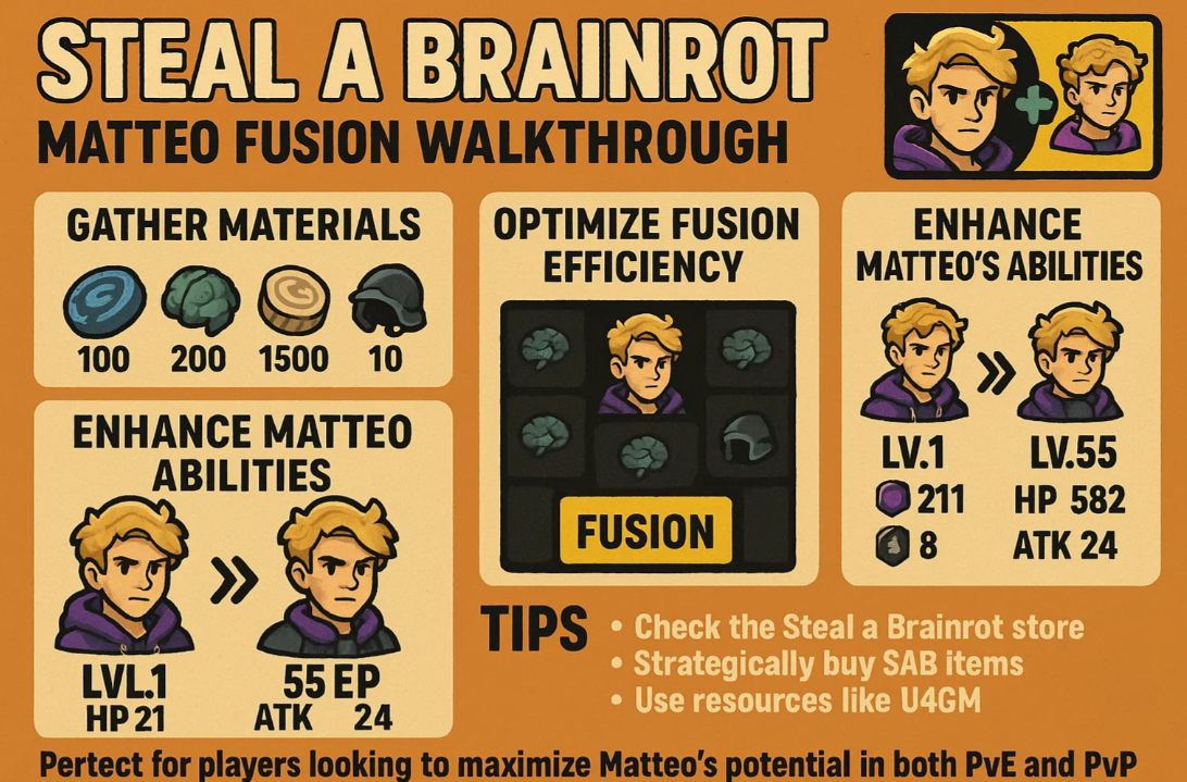 This guide provides Steal A Brainrot players with a complete walkthrough for Matteo fusion. Learn how to gather materials, optimize fusion efficiency, and enhance Matteo’s abilities post-fusion. Tips include checking the Steal a Brainrot store, strategically buying SAB items, and using resources like U4GM to streamline the process. Perfect for players looking to maximize Matteo’s potential in both PvE and PvP.
