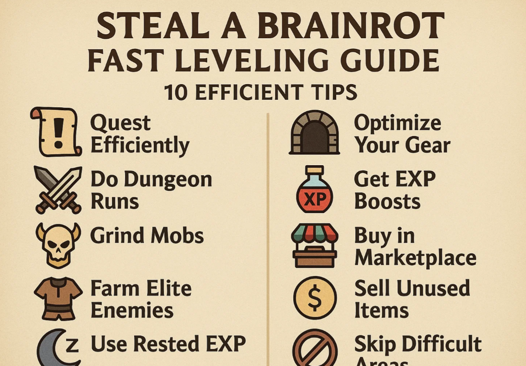 This article shares 10 practical tips to level up quickly and efficiently in Steal a Brainrot. From prioritizing main quests, optimizing daily tasks, farming in high-respawn areas, and balancing solo and party play, to using gear upgrades, boosts, and marketplace strategies, it provides a complete guide for smarter progression. It also highlights when to buy Steal a Brainrot items and how to find the Best place to buy Steal a Brainrot brainrots without wasting resources. Perfect for players who want to progress faster while keeping the game fun.